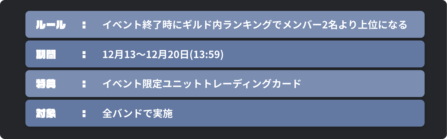 イベント最終日のギルドの総パワーポイントをポイント換算したもの+個人の城レベルのポイント換算した合計のポイントが高いギルドが優勝!あなたの活躍がギルドを優勝に導きます!